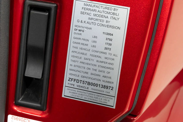 VIN: ZFFDT57B000138972 Year: 2004 Ext. color: Rosso Magma Int. color: Red-black leather Stripe: Yes (???) Shields: Yes |