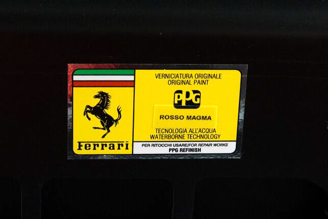 The paint code sticker of your Challenge Stradale can be found under the front bonnet. Ferrari paint by PPG Industries.