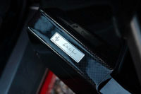 Interior in black leather, mixed with red and black alcantara, carbon fiber trims and carpets in superfabric.