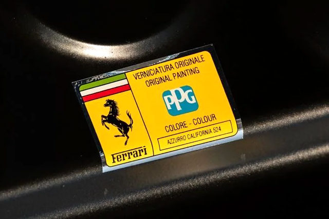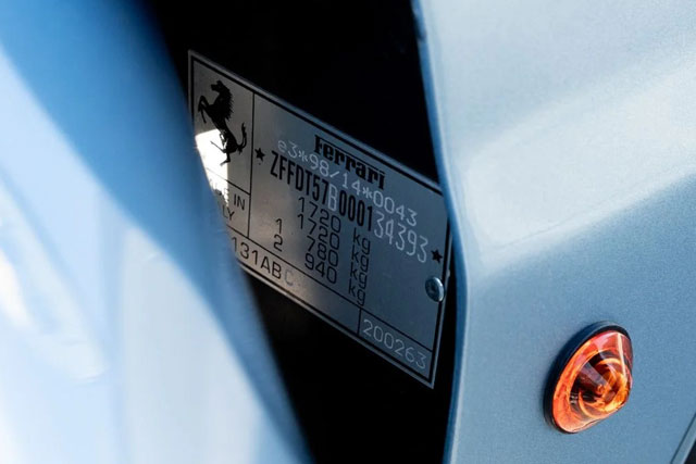 VIN: ZFFDT57B000134393 Year: 09/2003 Ext. color: Azzurro California 524 Int. color: Black alcantara Stripe: No Shields: Yes |